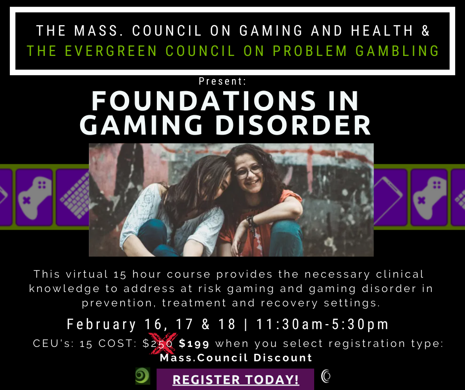 OnlineThe Mass. Council on Gaming and Health and the Evergreen Council on Problem Gambling Present: Foundations in Gaming Disorder This virtual 15 hour course meets February 16, 17 & 18, 2021 from 11:30am – 5:00pm EST each day COST: $199 when you select registration type: Mass.Council Discount Presenters: Dr. Cosette Rae, Dr. Marc Potenza, Dr. […]